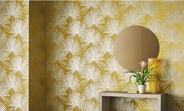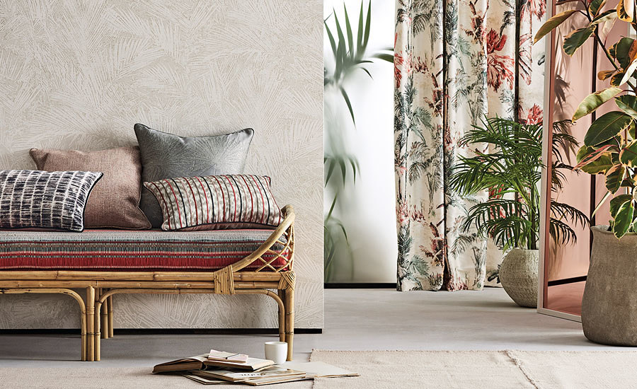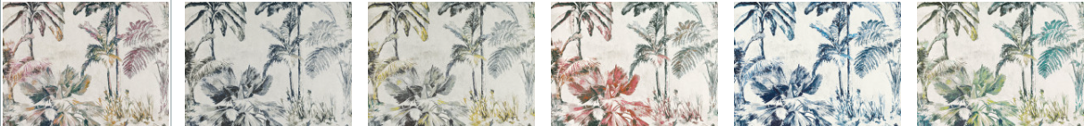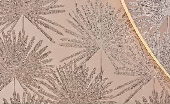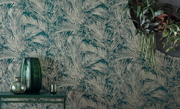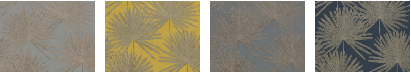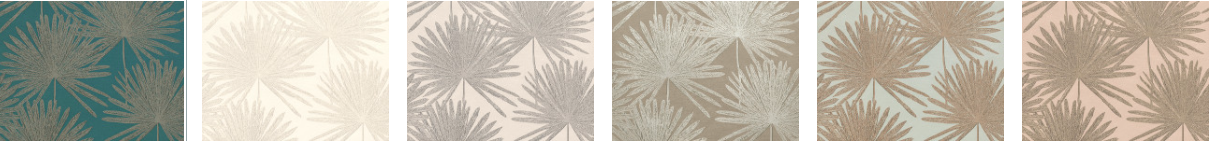 Descripción: Hojas de palmera densas crean una escena exótica; Areca se infunde con metálicos brillantes y se presenta en una paleta amplia que va desde neutros utilizables hasta tonos parecidos a joyas.
