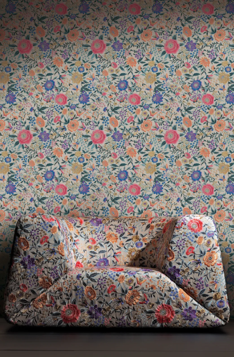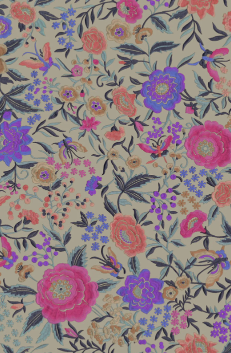 Oriental Garden como un ramo de flores bordado en tonos lila, rosa melocotón, amarillo, naranja y con tonalidades del gris.
