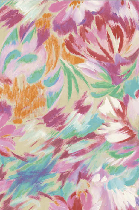Descripción: Una explosión de colores que, como pinceladas, crean un ramo de flores en movimiento. Una combinación vibrante de colores, rosas y rojos, celestes y verdes.