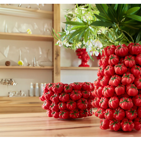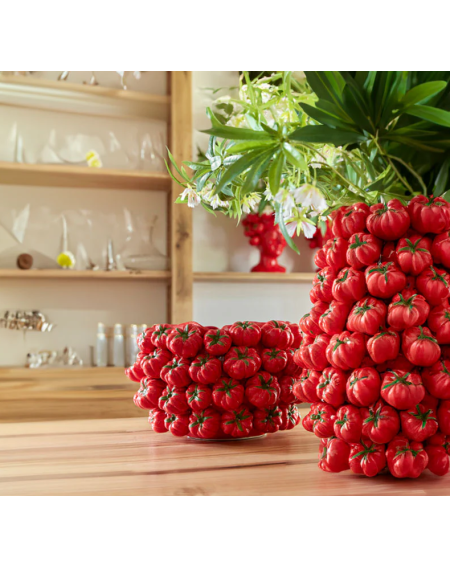 Nuestros jarrón de cerámica tomates aporta un aire natural y vibrante a cualquier espacio. Inspirado en la forma y color de los tomates frescos, este jarrón ofrece un diseño audaz y lleno de personalidad. Perfecto para cualquier amante de la naturaleza y el diseño innovador, este jarrón es una excelente opción para decorar tanto interiores como exteriores. Su vibrante color rojo y su forma estilizada lo convierten en un verdadero punto focal en cualquier habitación.