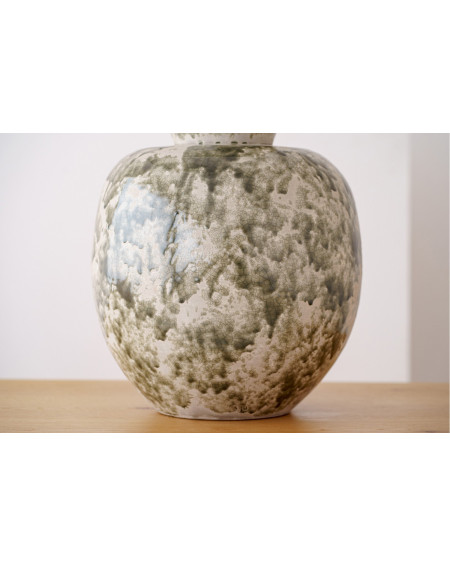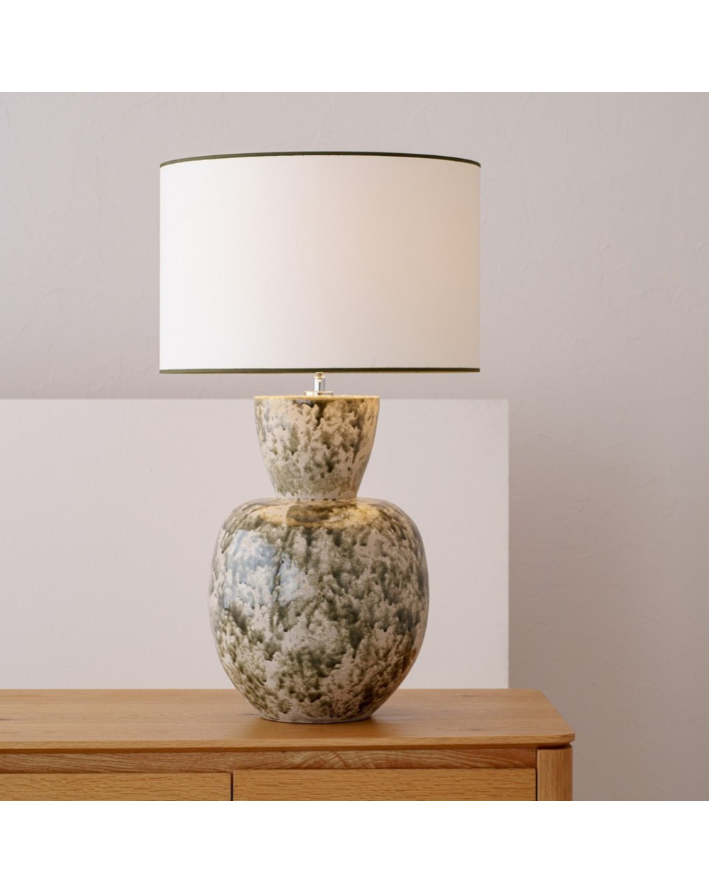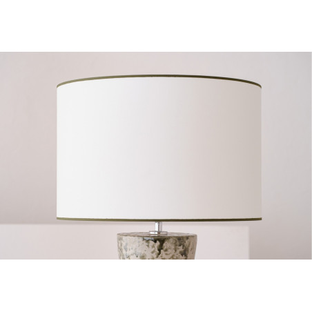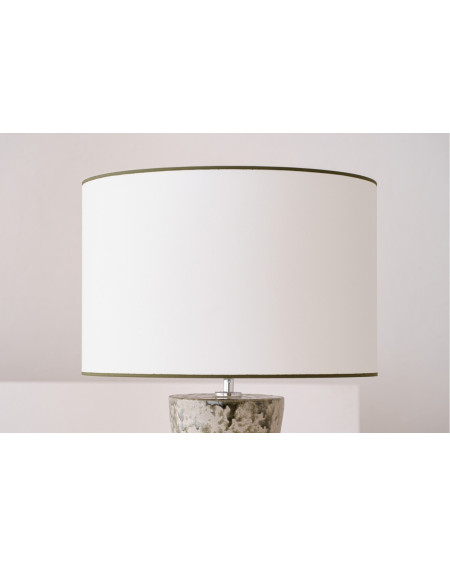 LÁMPARA DE MESA REALIZADA EN BARRO CON VIDRIADO Y PANTALLA EN ALGODÓN BLANCO ROTO Y VIVOS EN VERDE OSCURO. LA COLECCIÓN MUSGO SE CARACTERIZA POR SU VOLUMEN REDONDEADO EN DOS CUERPOS DONDE LA PARTE SUPERIOR DE LA BOCA TIENE FORMA CÓNICA INVERTIDA. EL ACABADO VIDRIADO SE REALIZA EN TONOS VERDES APLICADO DE FORMA IRREGULAR POR TODA LA SUPERFICIE. EL VIDRIADO NO LLEGA A CUBRIR LA PIEZA POR COMPLETO DEJANDO ESPACIOS DONDE SE PERCIBE LA RUGOSIDAD DE LA PASTA NATURAL. EL DECORADO DE ESTAS PIEZAS SE REALIZA A MANO POR LO QUE EL PROCESO DE VIDRIADO ES DIFERENTE EN CADA UNA Y LOS VIDRIOS EMPLEADOS REACCIONAN DE MANERA DIFERENTE EN EL HORNO DE COCCIÓN.